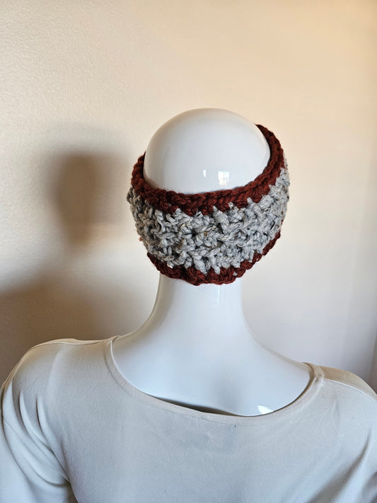 Wool Blend Ear Warmer. Crochet Headband. Handmade Headwear. Deep Red and Gray. Adult size headband. Unisex Gifts. Hand Knit Ear Warmer.