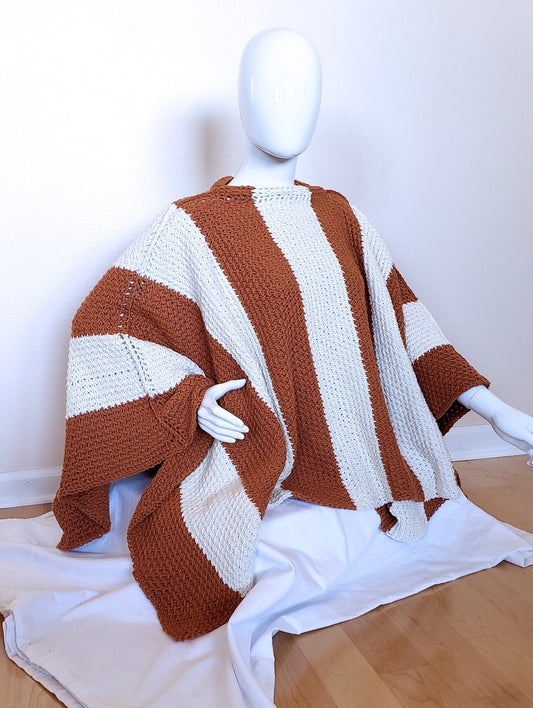 Vertically Striped Pumpkin and Cream poncho. Textured crochet wrap. Unisex 3-season coverup. Adult size poncho. Handmade Boho Wrap.