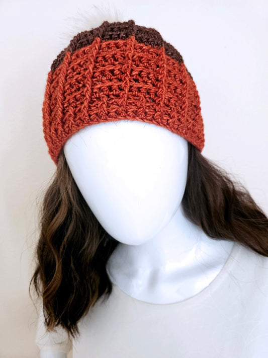 Waffle Stitch Winter Beanie. Orange & Brown Stocking Cap. Unisex Winter Hat. Pom Pom Beanie. Adult Wool Alpaca Hat. Textured Crochet Beanie.